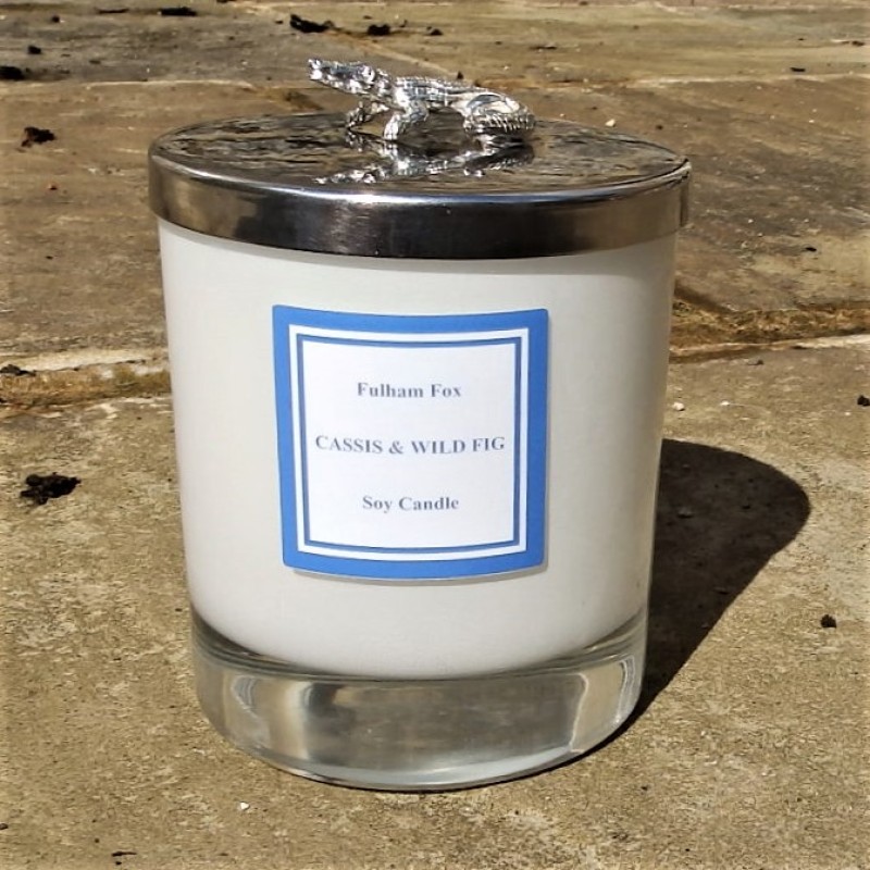 This scented candle combines the fresh fragrances of wild fig and cassis, mixing Mediterranean with English Garden. Featuring one of Fulham Fox's trademark silver crocodile designs on the lid. A sophisticated addition to any setting, morphing into a smart storage jar once fully burned.