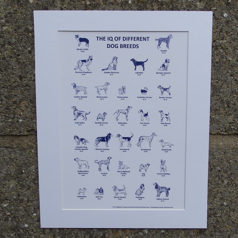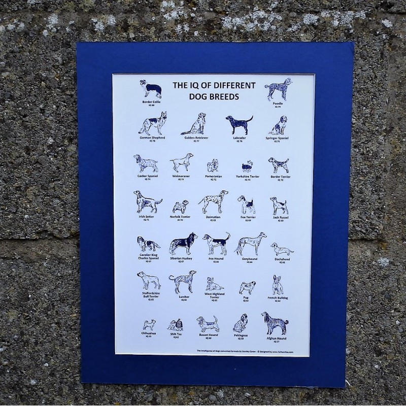 Our wonderful and exciting IQ of different dog breeds design as a print with a choice of white or cobalt blue mount - fit into a 14 x 11 inch frame.