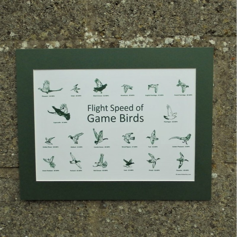 Flight Speed of Game Birds PrintOur wonderful and exciting flight speed of game birds design comes as a print with a choice of white or green mount- fit into a 14 x 11 inch frame.