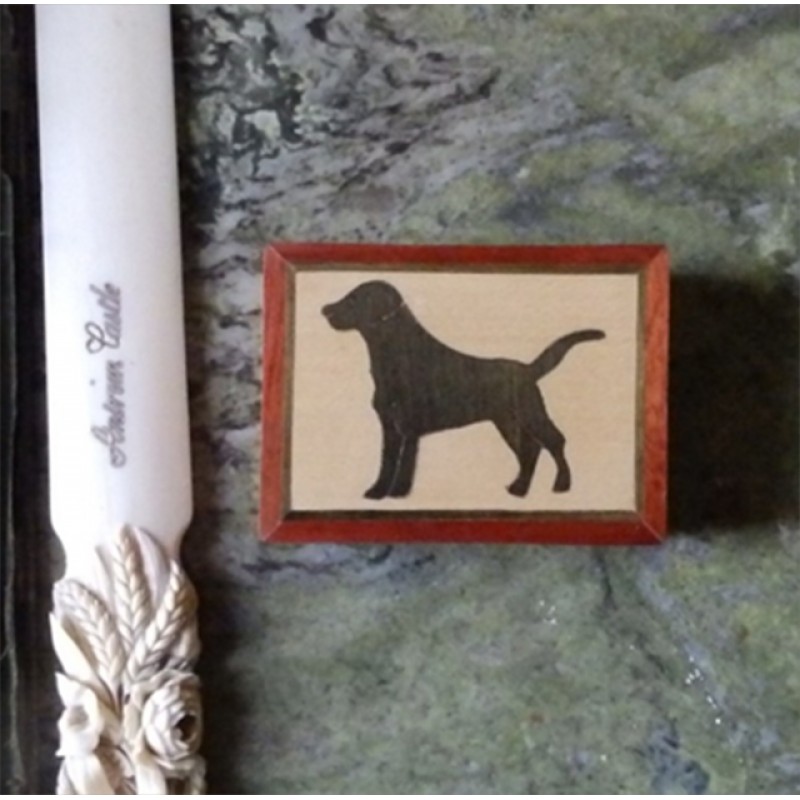 Secret rosewood box with a marquetry Black Lab engraving, has a clever catch on the base which when slid across opens the design.