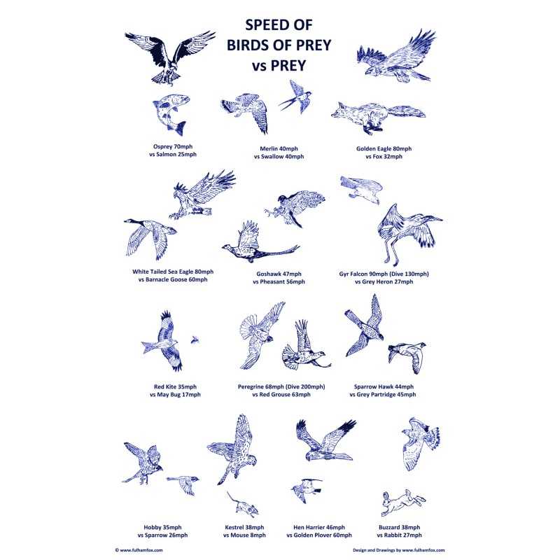 This tea towel features illustrations of the speeds majestic UK birds of prey - against the speeds of the prey they hunt. On a cream/white background in a naval blue colour.