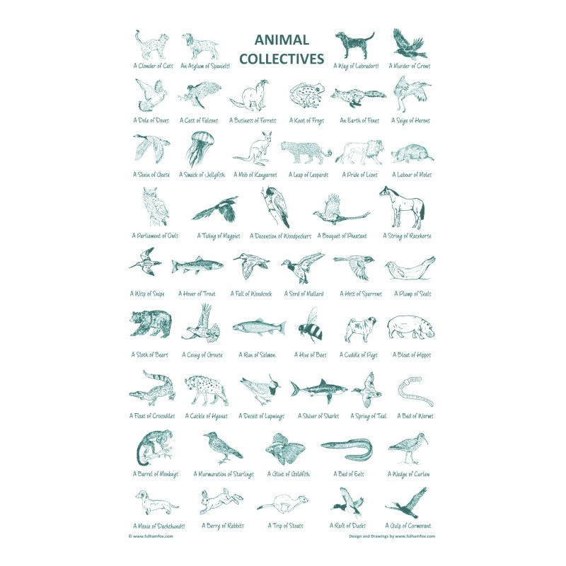 Our Animal Collective tea towel is a perfect way to teach (particularly little ones) names of various collections of animals  - such as a pride of lions.  The design features magnificent sketches of animals in a sea green colour on a white/cream background.