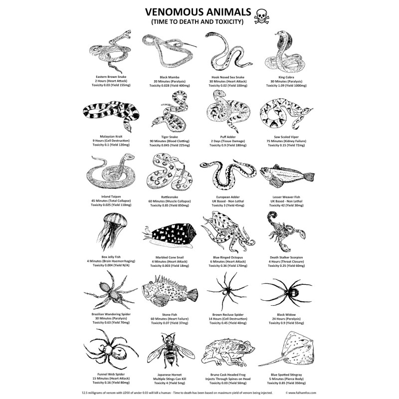 Venomous Animals (The worlds most deadly) with cause and time to Death - 12.5 milligrams of Venom with LD50 of under 0.03 will kill a human - Time to death has been based on the maximum yield of venom from that animal being injected.
