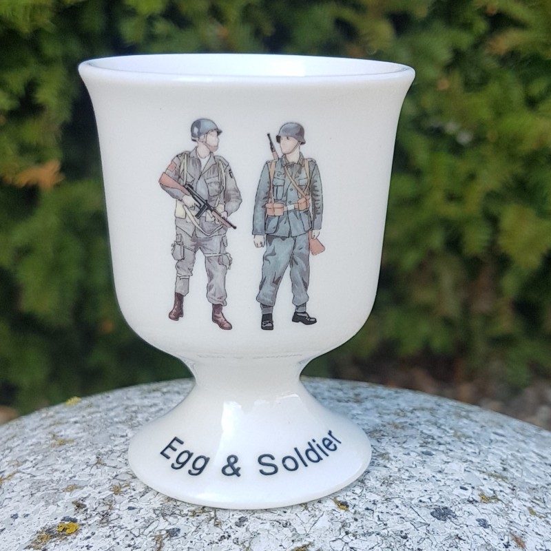 English Bone China Egg Cup with a picture of 2 World War Two soldiers along with the catchy egg and soldier caption on the base.